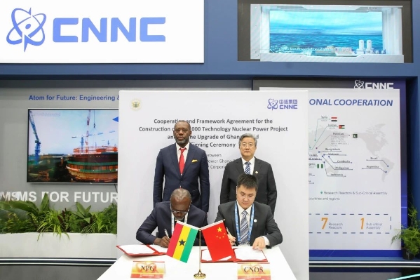 IAEA總干事拉斐爾·格羅西,世界能源理事會(huì)CEO安吉拉,WNA總干事薩瑪·萊昂,加納能源部長馬修·普倫佩,馬拉維能源部長易卜拉欣·馬托拉,法國原委會(huì)副主席皮凱蒂,加拿大核協(xié)會(huì)主席約翰·戈?duì)柭?,法國電力公司董事長呂克·雷蒙,國家能源局總經(jīng)濟(jì)師魯俊嶺、科技部中國國際核聚變能源計(jì)劃執(zhí)行中心副主任王敏、中國電力聯(lián)合會(huì)理事長辛保安等中外領(lǐng)導(dǎo)嘉賓參觀了展臺。展會(huì)期間,中核集團(tuán)與加納能源部、法國電力集團(tuán)等重要合作伙伴進(jìn)行了雙邊會(huì)談。中國中原與加納核電公司簽署了核電項(xiàng)目合作框架協(xié)議。