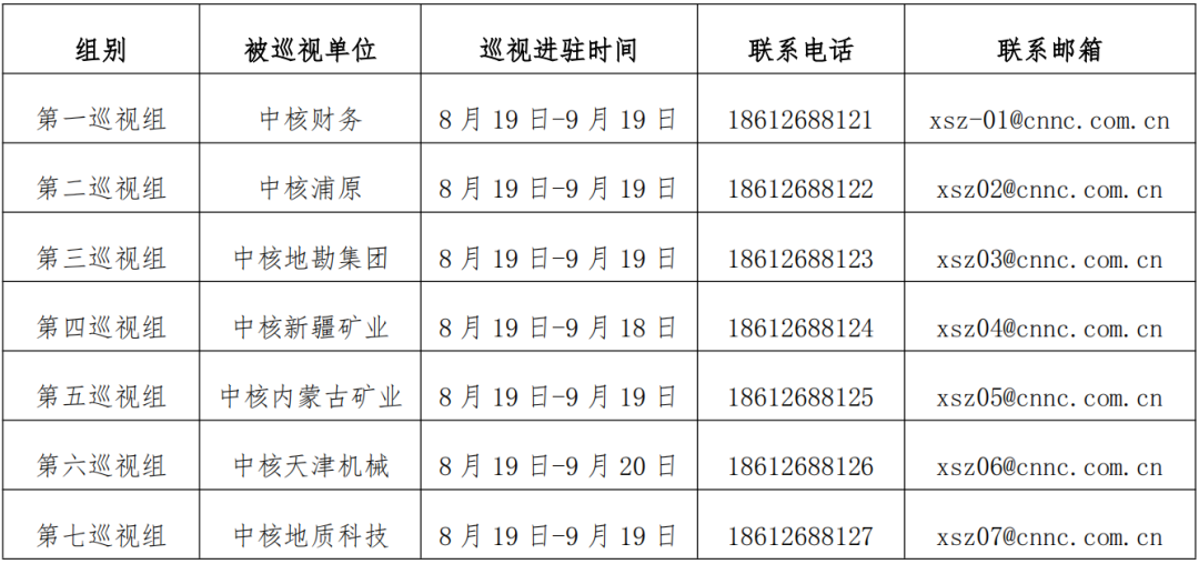 根據(jù)中核集團黨組巡視工作統(tǒng)一部署,8月19日,黨組第一至第七巡視組分別進駐中核財務有限責任公司、上海中核浦原有限公司、中核地質(zhì)勘查集團有限公司、中核新疆礦業(yè)有限公司、中核內(nèi)蒙古礦業(yè)有限公司、中核(天津)機械有限公司、中核地質(zhì)科技有限公司等7家單位并召開巡視工作動員會。