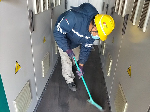 該電站毗鄰當(dāng)?shù)貫跆m布和沙漠,廠址周邊植被少,冬季多為大風(fēng)天氣,為防止光伏板被風(fēng)吹落,該公司運(yùn)維人員對(duì)光伏組件基礎(chǔ)進(jìn)行細(xì)致檢查,對(duì)相對(duì)薄弱的區(qū)域進(jìn)行埋石填土加固,對(duì)組件支架銹蝕的螺栓及時(shí)進(jìn)行更換,對(duì)傾斜的立柱進(jìn)行校正固定;站內(nèi)防凍措施已提前落實(shí),但隨著氣溫的降低,相關(guān)防護(hù)需要每日一檢,該公司運(yùn)維人員對(duì)生活水井的保暖措施進(jìn)行再加固,在井蓋上方罩住多層保溫被,隔離井口積水,為閥門(mén)制作防護(hù)罩,保證生活用水正常供應(yīng),同時(shí)對(duì)電暖氣和空調(diào)開(kāi)展全面檢查,對(duì)用電負(fù)荷電流進(jìn)行鉗測(cè),避免過(guò)負(fù)荷故障和火災(zāi)事故;在主設(shè)備風(fēng)沙防治上,這群年輕人狠下功夫,他們每天在太陽(yáng)下山前開(kāi)好工作票,在太陽(yáng)下山后做好安全措施,集中清掃逆變器室和箱變室塵土和更換濾網(wǎng),每日清掃一組,一個(gè)月一輪回,解決逆變器及箱變積沉較多、散熱不良問(wèn)題;在送出線路檢查上,他們每日對(duì)17條站內(nèi)線路和1條送出線路進(jìn)行徒步巡線,細(xì)致檢查桿塔金具、導(dǎo)線、地線固定情況,并利用夜間停電機(jī)會(huì)及時(shí)消除異常隱患,保證涉網(wǎng)設(shè)備正常運(yùn)行。
