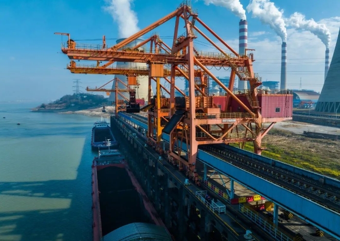 鄂州電廠運(yùn)煤碼頭正在卸煤