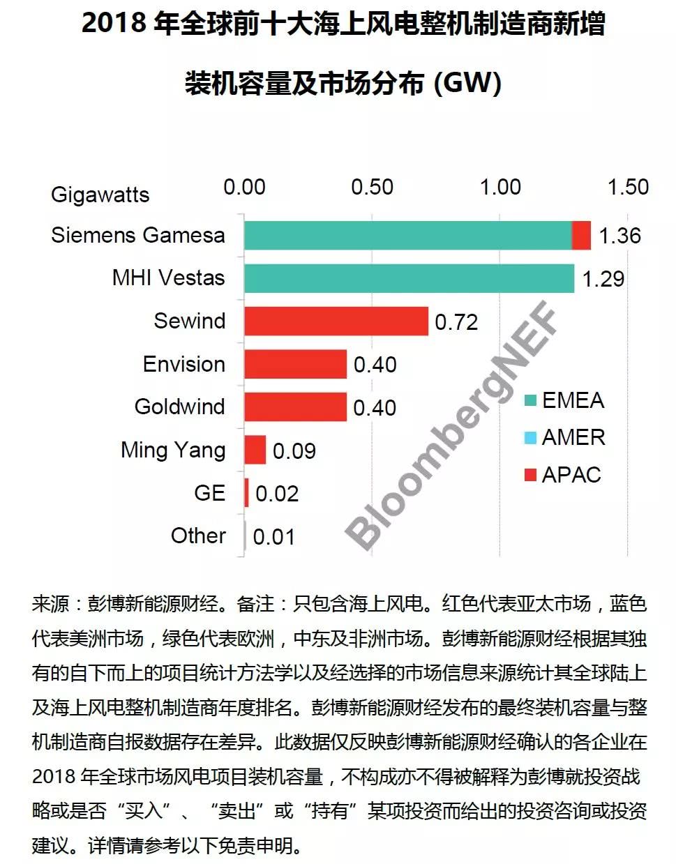 Siemens Gamesa2018年全球海上風(fēng)電新增裝機(jī)容量為1.36GW,市場份額達(dá)32%,繼續(xù)領(lǐng)跑全球海上風(fēng)電市場。