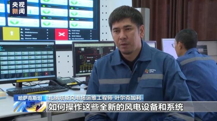 總臺(tái)記者 張譽(yù)耀:這里就是札納塔斯,哈薩克斯坦最大的風(fēng)力發(fā)電場(chǎng)之一,像我身后這樣一座風(fēng)能發(fā)電機(jī)能滿足當(dāng)?shù)丶s4000戶家庭的用電需求,而我身后一共有40座這樣的風(fēng)能發(fā)電機(jī),也就是說能夠滿足當(dāng)?shù)?6萬戶家庭的用電需求。正是這一座座轉(zhuǎn)動(dòng)的風(fēng)能發(fā)電機(jī),點(diǎn)亮了札納塔斯這座小城的日常生活。