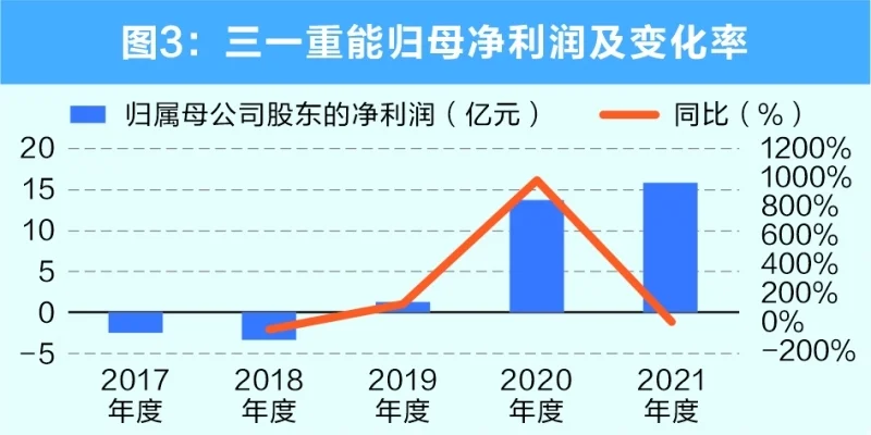 營業(yè)收入的高增長也帶來了三一重能盈利能力的快速提升。2019年至2021年,公司實(shí)現(xiàn)歸屬于母公司所有者的凈利潤1.26億元、13.72億元和15.91億元,增速分別為137.19%、992.53%和16.01%(見圖)。