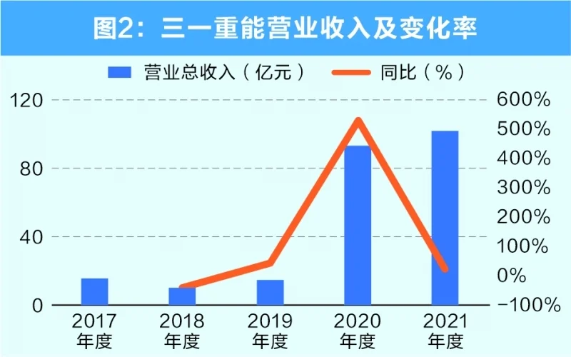 得益于風(fēng)電行業(yè)整體的快速發(fā)展,以及公司自身產(chǎn)品的逐步成熟,及補(bǔ)貼退坡前的風(fēng)電搶裝潮驅(qū)動,三一重能業(yè)務(wù)規(guī)模呈現(xiàn)跨越式發(fā)展。2019年至2021年,三一重能分別實(shí)現(xiàn)營業(yè)收入14.81億元、93.11億元和101.75億元,同比增長43.14%、528.57%和9.28%(見圖)。