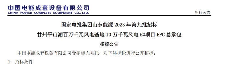 公告顯示,甘州平山湖百萬千瓦風電基地 10 萬千瓦風電 5#項目位于甘肅省張掖市甘州區(qū)平山湖蒙古族鄉(xiāng)境內,裝機容量 100MW,計劃安裝 10臺單機容量 5.5MW、 9 臺單機容量 5.0MW 的風電機組,新建 100MW 風電場、 110kV 升壓站、15MW/60MWh 儲能、新建約 5 公里 110kV 送出線路接入對側 330kV 匯集站。