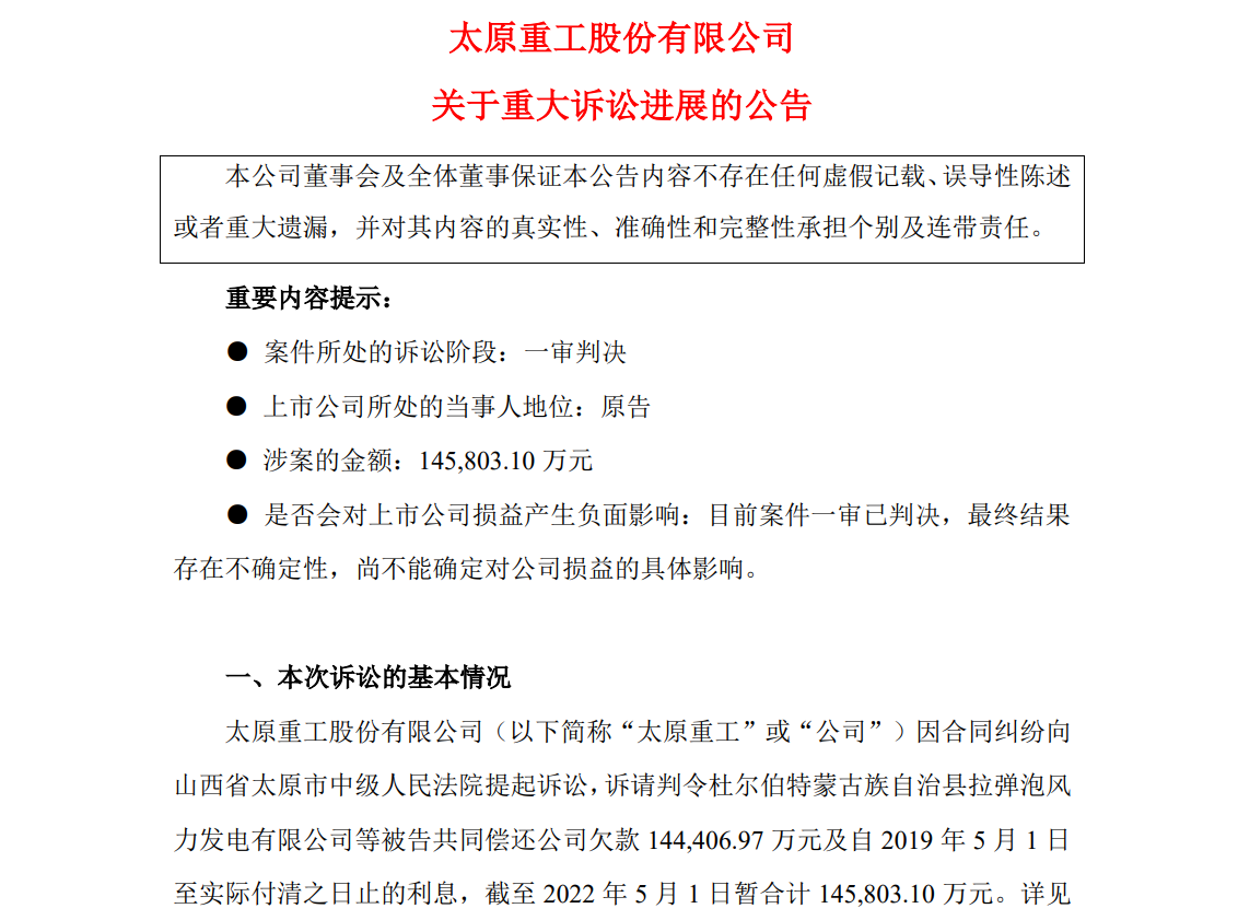 公告披露,太原重工因合同糾紛向山西省太原市中級人民法院提起訴訟,訴請判令杜爾伯特蒙古族自治縣拉彈泡風(fēng)力發(fā)電有限公司(以下簡稱“拉彈泡公司”)等被告共同償還公司欠款144,406.97萬元及自2019年5月1日至實(shí)際付清之日止的利息,截至2022年5月1日暫合計145,803.10萬元。