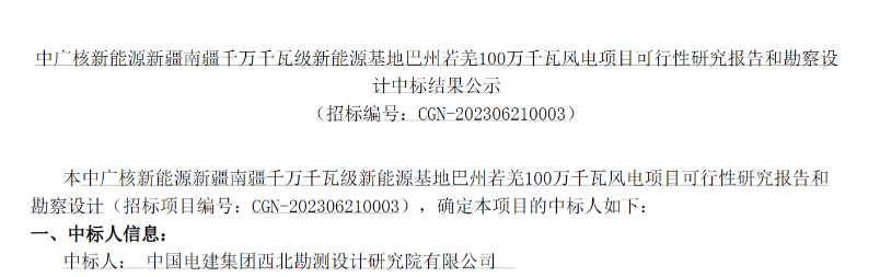 8月10日,中廣核電子商務(wù)平臺發(fā)布《中廣核新能源新疆南疆千萬千瓦級新能源基地巴州若羌100萬千瓦風(fēng)電項(xiàng)目可行性研究報(bào)告和勘察設(shè)計(jì)中標(biāo)結(jié)果公示》的公告。