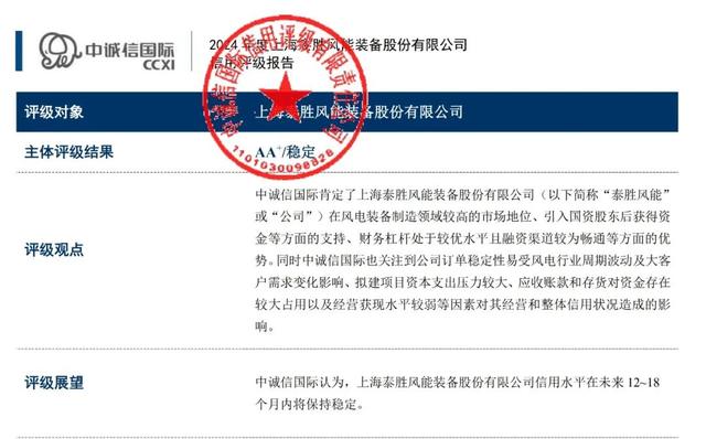 近日,上海泰勝風(fēng)能裝備股份有限公司(以下簡稱“泰勝風(fēng)能”)經(jīng)中誠信國際信用評級有限責(zé)任公司(以下簡稱“中誠信”)嚴(yán)格評審,被授予主體信用等級“AA+”,評級展望穩(wěn)定,成為風(fēng)電行業(yè)風(fēng)電支撐結(jié)構(gòu)第一家“AA+”企業(yè)。