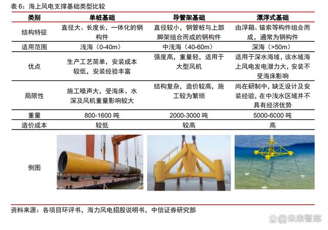 塔筒、樁基是風(fēng)電設(shè)備中的支撐基礎(chǔ)部件,分別用于連接和承載風(fēng)電機(jī)組、支撐和固 定整機(jī)。風(fēng)電塔筒除塔體外,其內(nèi)部通常有爬梯、電纜梯、平臺等內(nèi)部結(jié)構(gòu),以供風(fēng)電機(jī) 組的運(yùn)營及維護(hù)使用。風(fēng)電支撐基礎(chǔ)分為單樁、導(dǎo)管架和漂浮式基礎(chǔ)三類,淺海區(qū)域中機(jī) 組安裝在下端深入海床地基的樁基或?qū)Ч芗苌?,由海床地基提供支?深海區(qū)域中樁基、 導(dǎo)管架有長度限制,無法實現(xiàn)支撐功能,漂浮式基礎(chǔ)主要由浮箱及錨繩組成,浮箱為海上 風(fēng)電機(jī)組提供支撐力,并通過錨索或纜繩將塔筒與海底相連,使機(jī)組可以在某一相對固定 的區(qū)域內(nèi)自由移動。