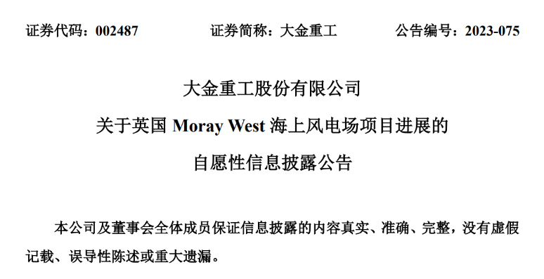 8月31號,大金重工股份有限公司(以下簡稱“大金重工”或“公司”)發(fā)布《關(guān)于英國Moray West海上風(fēng)電場項目進展的自愿性信息披露公告》。