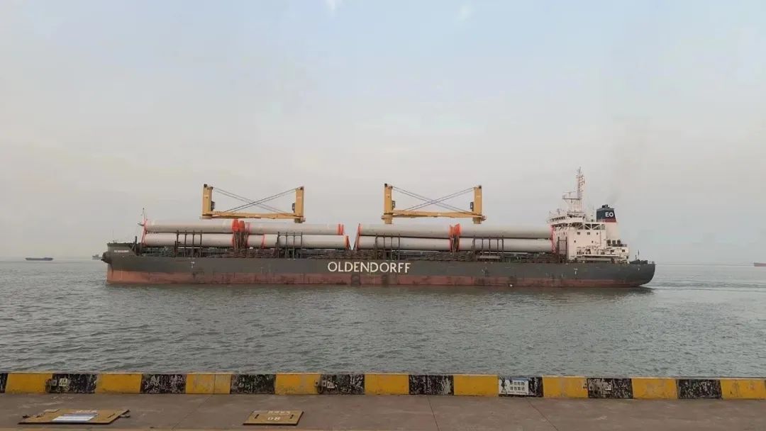 本批次發(fā)運的15套、75段塔筒,由國際知名的散雜貨遠(yuǎn)洋運輸公司“OLDENDORF”船公司承運,將歷時近一個月直接運抵澳大利亞,交付至GE公司。該批次15套風(fēng)電機組投運后,每年可以提供約5億度的清潔電力,滿足當(dāng)?shù)丶s10萬戶家庭1年的用電量。