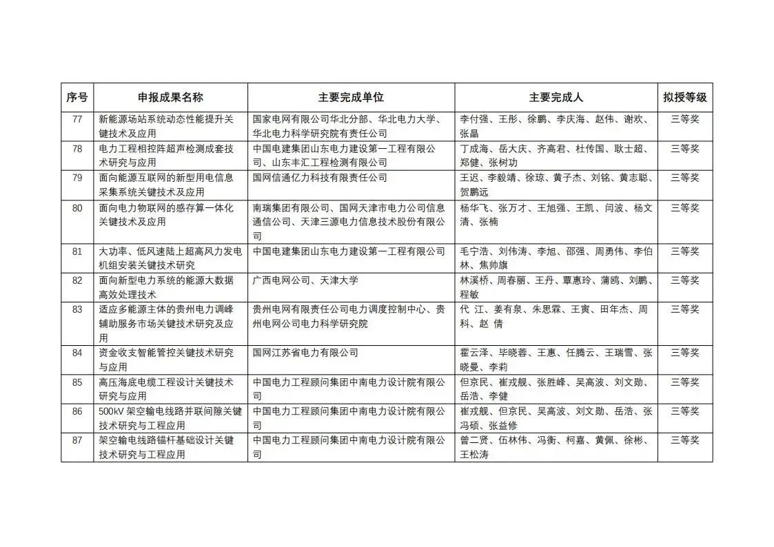 中國電力發(fā)展促進(jìn)會(huì)科學(xué)技術(shù)獎(jiǎng)勵(lì)委員會(huì)于2023年10月18日召開審定會(huì)議,審定確認(rèn)2023年度科學(xué)技術(shù)獎(jiǎng)(數(shù)智電力類)擬授獎(jiǎng)成果共計(jì)87項(xiàng)(排名不分先后),其中擬授一等獎(jiǎng)15項(xiàng)、二等獎(jiǎng)28項(xiàng)、三等獎(jiǎng)44項(xiàng)。