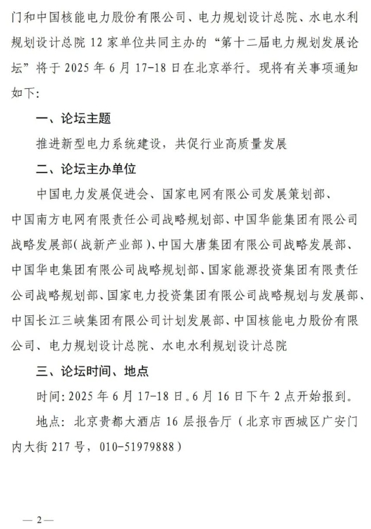 關(guān)于召開(kāi)2025第十二屆電力規(guī)劃發(fā)展論壇的通知