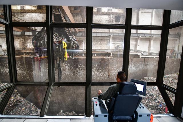 9月19日,在山東啟迪濟能環(huán)??萍加邢薰?,工作人員在控制室內操作設備吊運垃圾。