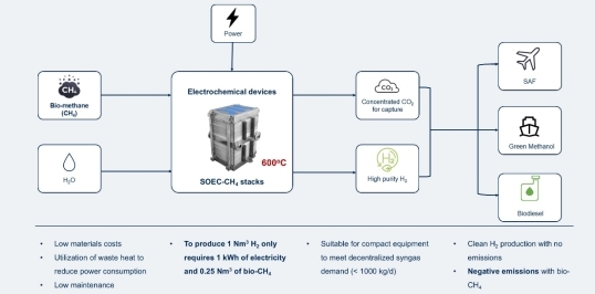 采用更先進的電化學(xué)路線,將生物天然氣、綠電、水輸入電堆,在600℃運行溫度下,同時產(chǎn)出高純度綠氫和自富集的CO2,一次性解決綠色燃料合成時的兩大重點原料的來源問題。不僅簡化了流程,更縮減了成本。在其他項目仍在使用其他電解水制氫裝備,以3-5度/標方的電耗制取綠氫,同時增設(shè)空氣捕集裝置來捕集CO2時。電堆科技已經(jīng)做到,制取1標方氫氣,僅需1度電及0.25標方生物天然氣,且無需增設(shè)空氣捕集裝置。
