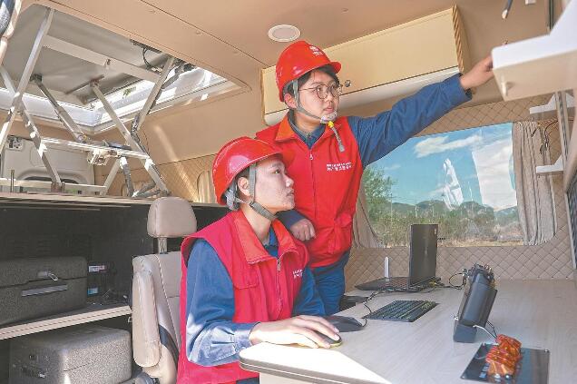 無(wú)人機(jī)智能巡檢黨員突擊隊(duì)隊(duì)員在無(wú)人機(jī)巡檢“航母”作業(yè)車(chē)內(nèi)查看山區(qū)輸配電線(xiàn)路情況