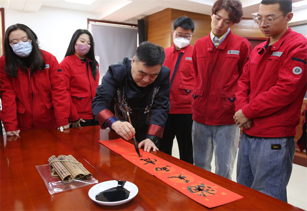 活動(dòng)中不僅觀看了書法大家揮灑自如、展示書法魅力的書寫,還激發(fā)了職工學(xué)習(xí)書法的熱情。宋永江主席隨即在現(xiàn)場(chǎng)進(jìn)行了書法傳授,用四句話講述了書法要點(diǎn):分割均勻、舉一反三、學(xué)會(huì)分析、穿插移正。精準(zhǔn)的教授,讓現(xiàn)場(chǎng)的青工們躍躍欲試。大家聚精會(huì)神地欣賞著剛寫好的春聯(lián),有的還跟著讀了出來。參加活動(dòng)的書法愛好者劉亭汝說“春節(jié)是我們的傳統(tǒng)節(jié)日,貼對(duì)聯(lián)是象征吉祥,表達(dá)人們對(duì)美好生活的向往,很高興能為我們基層職工帶來這樣一份有意義的新春祝福。”新入職員工也表示宋主席的書法飄若浮云,矯若驚龍,字里行間流露出對(duì)單位員工真切的祝福,讓我們心里暖暖的。