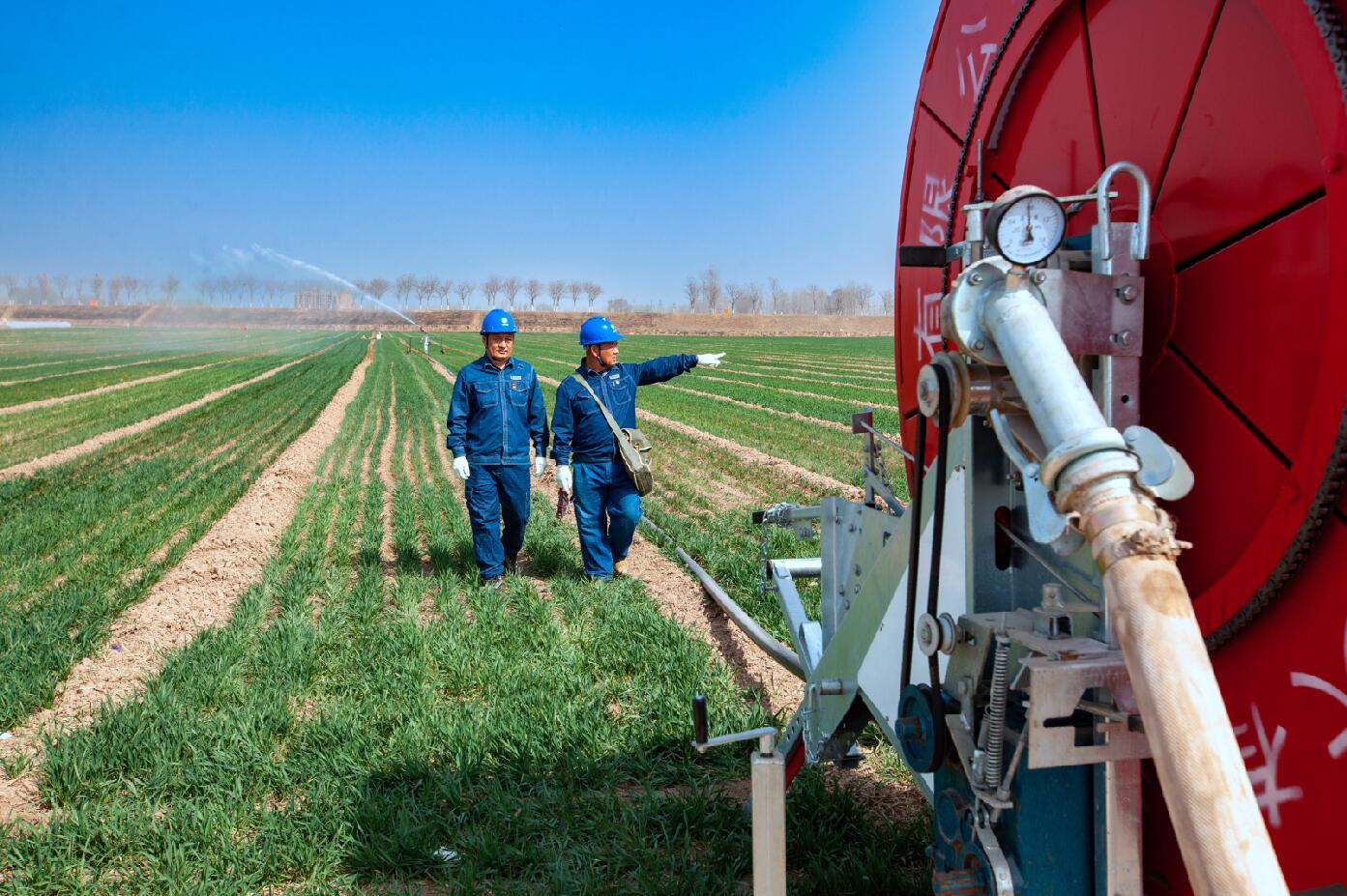 春撫萬物,水潤“糧倉”。在“豫北糧倉”滑縣麥田里,噴灌機(jī)正在努力工作,源源不斷地將清水撒向青翠的麥苗,陽光照射下水霧七彩斑斕,一副中原糧倉春灌生產(chǎn)的絕美畫卷。在這幅畫卷中,電力工作人員正在開展春灌保供電服務(wù)。