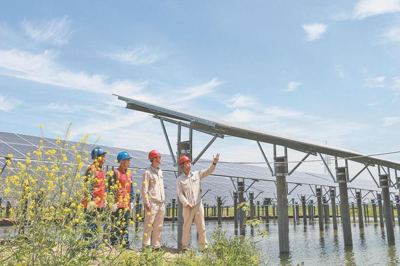 2024年4月25日,黨員服務(wù)隊(duì)隊(duì)員和肥東縣晶斗光伏電站員工共同巡檢發(fā)電設(shè)備。陳海東 攝