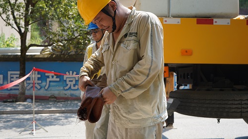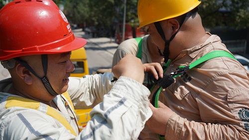 “帶電作業(yè)的方法有三種,分別是中間電位作業(yè)法、地電位作業(yè)法以及等電位作業(yè)法,今天我們采用的中間電位作業(yè)法。今天天氣不錯(cuò),雖然溫度高,但濕度低,能夠滿足帶電作業(yè)條件。帶電作業(yè)必須身著密不透風(fēng)的絕緣套裝,在高溫下,作業(yè)人員體感往往會(huì)達(dá)到60℃。雖然辛苦,但只要能少停電,盡可能的給人民群眾帶去清涼,再苦再累都值得。”帶電作業(yè)班班長(zhǎng)張敏說(shuō)道。
