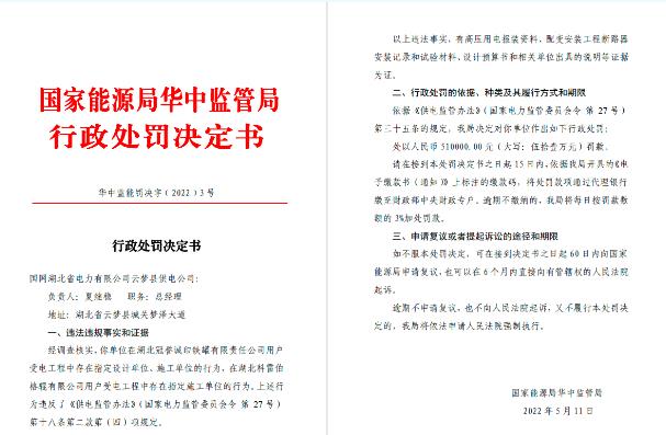 國(guó)家能源局華中監(jiān)管局12月7日公布的一則行政處罰信息顯示,國(guó)網(wǎng)湖北省電力有限公司云夢(mèng)縣供電公司在用戶(hù)受電工程中存在指定設(shè)計(jì)單位、施工單位的行為,被處以罰款51萬(wàn)元。