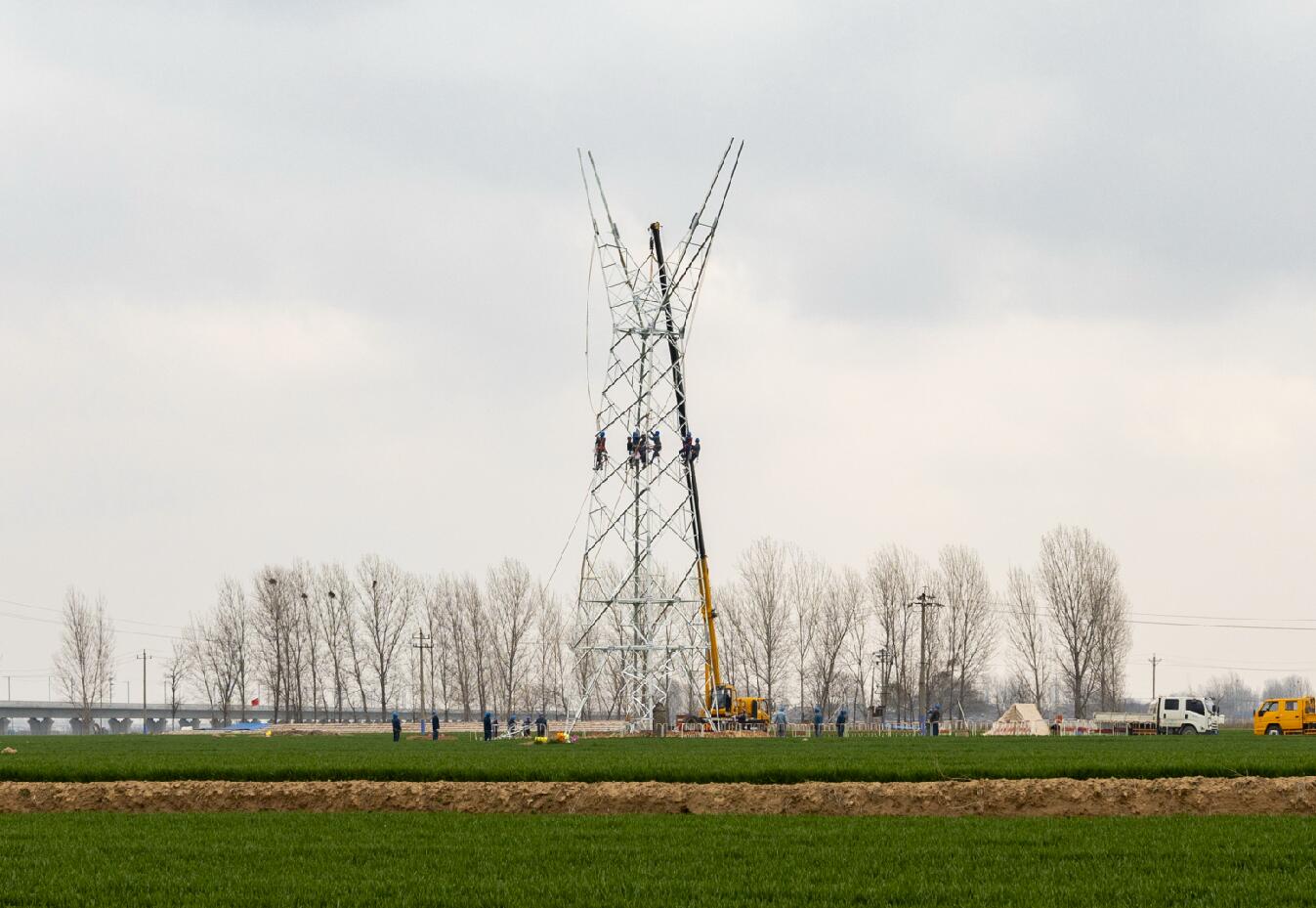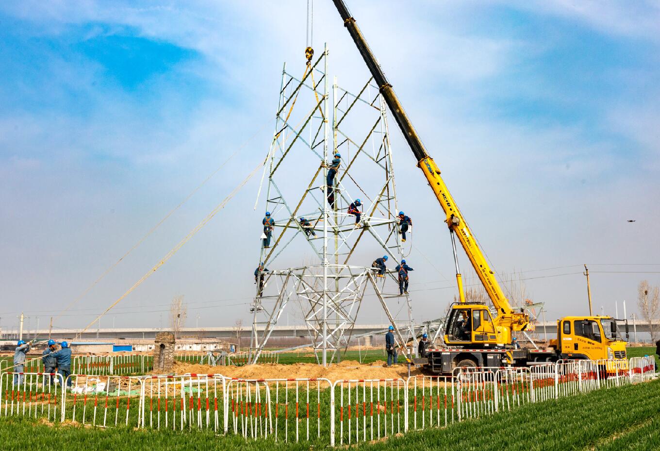 3月12日,在河南滑縣白道口鎮(zhèn)后吾旺村,太陽(yáng)剛出來(lái),麥苗上還掛著晶瑩的露珠。走在麥隴間有種踏春的喜悅,露珠也瞬間浸透了腳上的鞋??聪蚰沁厖s是另一番景象,新建220千伏電力線路跨越高鐵工程正在緊張實(shí)施中?,F(xiàn)場(chǎng)國(guó)網(wǎng)滑縣供電公司的施工人員,早已開(kāi)始了組立鄭濟(jì)鐵路(滑縣段)第75號(hào)鐵塔,等76號(hào)鐵塔也組裝完后,73號(hào)鐵塔與76號(hào)鐵塔導(dǎo)線放通,鄭濟(jì)鐵路(滑縣段)全線路貫通。為下一步鄭濟(jì)高鐵聯(lián)調(diào)聯(lián)試、試車(chē)及最后投入運(yùn)營(yíng)提供可靠電力支撐。
