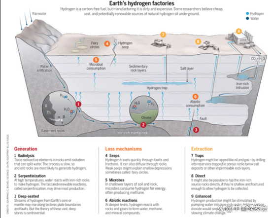 (圖片描述:氫是如何在地下形成的。來源:《科學(xué)》期刊的“隱藏的氫氣:地球上有大量可再生無碳燃料嗎?”)
