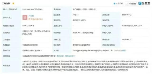 簽署合作協(xié)議僅5天,中廣通科技(酒泉)有限公司成立。根據(jù)天眼查顯示,該公司地址位于酒泉市肅州區(qū)公園路36號201室。