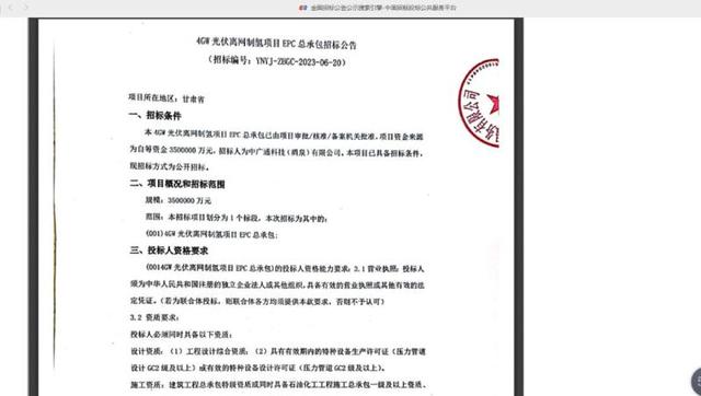通報還稱,6月12日,該公司在區(qū)市場監(jiān)管局注冊全資子公司中廣通科技(酒泉)有限公司。6月13日,中廣通科技(酒泉)有限公司工作人員嚴微明向項目聯(lián)系人、區(qū)工信局副局長馬斌提交公司營業(yè)執(zhí)照復印件、《“離網(wǎng)制氫”項目投資合作協(xié)議》兩份資料,由馬斌代其在甘肅省政務網(wǎng)在線審批監(jiān)管平臺提交了項目備案申請,區(qū)發(fā)改局政務大廳首席代表李倩在向分管領導王泉德匯報,并向酒泉新能源綜合利用產(chǎn)業(yè)園管理辦公室副主任閆斌征求意見后,為該公司辦理了項目備案。6月21日,中廣通科技(酒泉)有限公司在未進行項目可行性研究,未辦理項目規(guī)劃、土地、環(huán)評等前期手續(xù),也未與相關部門溝通的情況下,在“中國招投標公共服務平臺”發(fā)布了《4GW光伏離網(wǎng)制氫項目EPC總承包招標公告》。