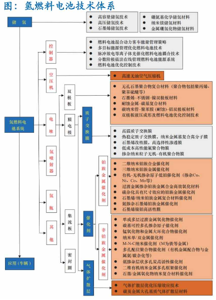 燃料電池系統(tǒng)是以燃料電池堆為基本單元,增加必要的輔助零部件構(gòu)成的一套完整的發(fā)電系統(tǒng)。氫燃料電池系統(tǒng)復(fù)雜,主要由電堆和系統(tǒng)部件(空壓機(jī)、增濕器、氫循環(huán)泵、氫瓶)組成;電堆是整個(gè)電池系統(tǒng)的核心, 包括由膜電極、雙極板構(gòu)成的各電池單元以及集流板、端板、密封圈等;膜電極的關(guān)鍵材料是質(zhì)子交換膜、催化劑、氣體擴(kuò)散層,這些部件及材料的耐久性等性能決定了電堆的使用壽命和工況適應(yīng)性。