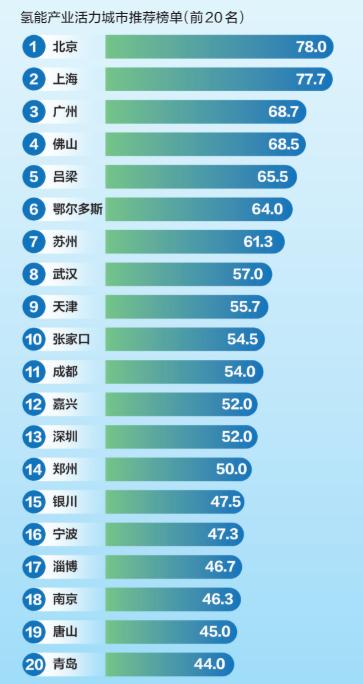 基于全國氫能產(chǎn)業(yè)發(fā)展的地區(qū)分布特點 ,新京報零碳研究院對主要城市的氫能資源稟賦 、政策環(huán)境 、產(chǎn)業(yè)規(guī)模 、項目投資 、基礎(chǔ)設施和企業(yè)數(shù)量等維度數(shù)據(jù)進行了量化和綜合評價 ,篩選出了全國20個氫能產(chǎn)業(yè)發(fā)展活力城市 。具體城市名單如下: