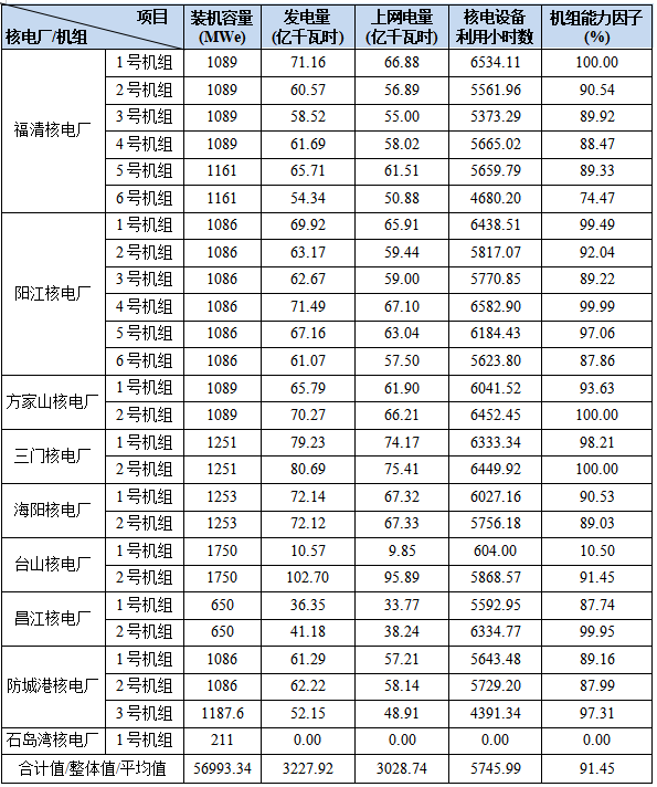 3)本表“合計值/整體值/平均值”中,裝機(jī)容量、發(fā)電量、上網(wǎng)電量為各機(jī)組合計值,核電設(shè)備利用小時數(shù)為全部機(jī)組整體值,機(jī)組能力因子為全部參與統(tǒng)計的機(jī)組的算數(shù)平均值。