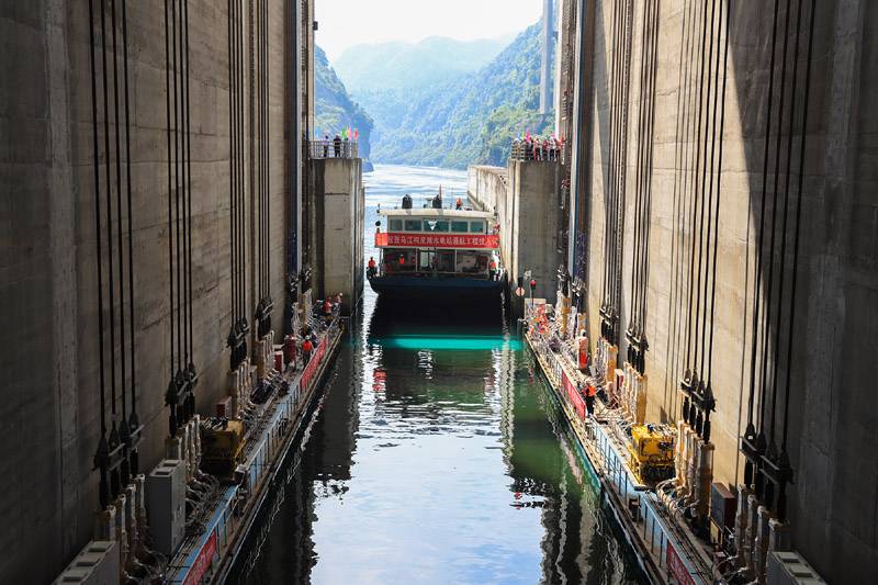 當(dāng)日,位于貴州省遵義市余慶縣境內(nèi)的烏江構(gòu)皮灘水電站通航工程開(kāi)始試運(yùn)行。構(gòu)皮灘水電站通航工程線路總長(zhǎng)2306米,由上下游引航道、三級(jí)垂直升船機(jī)和兩級(jí)中間渠道組成。投入試運(yùn)行后,500噸級(jí)船舶可從貴陽(yáng)的開(kāi)陽(yáng)碼頭依次通過(guò)構(gòu)皮灘、思林、沙沱、彭水,在重慶涪陵進(jìn)入長(zhǎng)江。