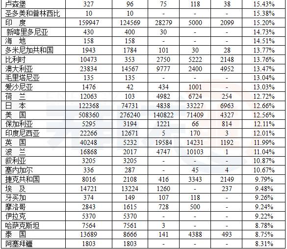 表2列出了154個國家的再生能源發(fā)電量,并有占發(fā)電總量的百分率;而且有再生能源發(fā)電總量的構(gòu)成。數(shù)據(jù)取自2012~2015年各國的數(shù)據(jù),當(dāng)然數(shù)據(jù)會不斷更新,但只會更好。由于地?zé)岚l(fā)電量小,未列入表中。