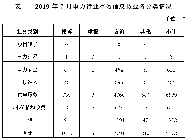 電力行業(yè)排在首位,有效信息數(shù)量為9673件,占全部有效信息的82.92%;其中受理的投訴舉報(bào)數(shù)量為1039件,占全部投訴舉報(bào)數(shù)量的96.38%。群眾反映的問題主要集中在供電服務(wù)、電力安全、成本價(jià)格和收費(fèi)等方面。(2019年7月電力行業(yè)有效信息按業(yè)務(wù)分類情況見表二)