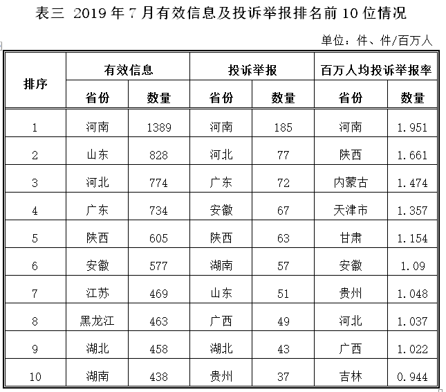 各?。ㄗ灾螀^(qū)、直轄市)按照收到的有效信息數(shù)量排序,河南、山東、河北、廣東、陜西等排在全國前10位;按照投訴舉報(bào)數(shù)量排序,河南、河北、廣東、安徽、陜西等排在全國前10位;按照百萬人均投訴舉報(bào)數(shù)量排序,河南、陜西、內(nèi)蒙古、天津、甘肅等排在全國前10位。(2019年7月有效信息及投訴舉報(bào)排名前10位情況見表三)