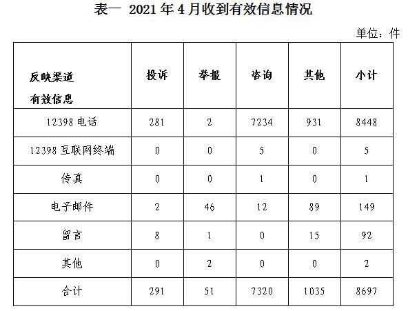 2021年4月,國(guó)家能源局12398能源監(jiān)管熱線(以下簡(jiǎn)稱12398熱線)共收到有效信息8697件(包含投訴、舉報(bào)、咨詢和其他訴求類別),環(huán)比增加3.13%,同比減少1.43%。(2021年4月收到有效信息情況見(jiàn)表一)