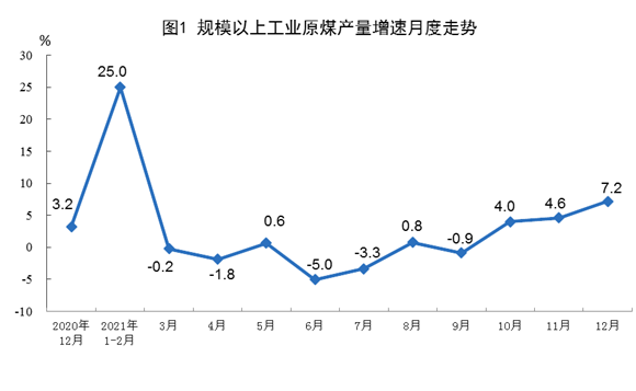 原煤生產(chǎn)繼續(xù)加快,進(jìn)口由增轉(zhuǎn)降。隨著增產(chǎn)保供政策持續(xù)推進(jìn),12月份,生產(chǎn)原煤3.8億噸,同比增長(zhǎng)7.2%,增速比上月加快2.6個(gè)百分點(diǎn),比2019年同期增長(zhǎng)10.7%,兩年平均增長(zhǎng)5.2%,日均產(chǎn)量1241萬噸;進(jìn)口煤炭3095萬噸,同比下降20.8%。
