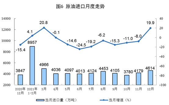 天然氣進(jìn)口增速回落。12月份,進(jìn)口天然氣1165萬噸,同比增長(zhǎng)3.8%,增速比上月回落14.0個(gè)百分點(diǎn)。2021年,進(jìn)口天然氣12136萬噸,比上年增長(zhǎng)19.9%。