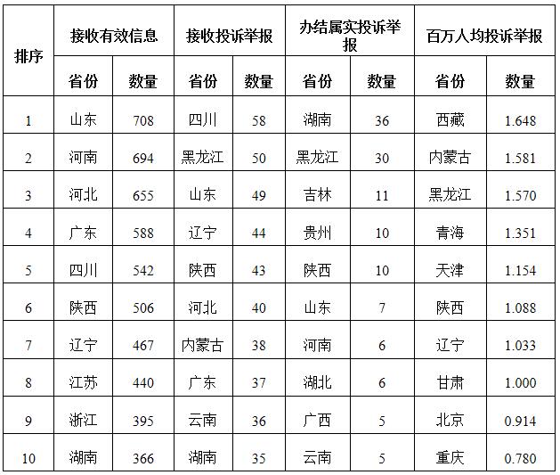各省(自治區(qū)、直轄市)按照接收的有效信息數(shù)量排序,山東、河南、河北、廣東、四川、陜西、遼寧、江蘇、浙江、湖南排在全國(guó)前10位;按照接收的投訴舉報(bào)數(shù)量排序,四川、黑龍江、山東、遼寧、陜西、河北、內(nèi)蒙古、廣東、云南、湖南排在全國(guó)前10位;按照辦結(jié)屬實(shí)的投訴舉報(bào)數(shù)量排序,湖南、黑龍江、吉林、貴州、陜西、山東、河南、湖北、廣西、云南排在全國(guó)前10位;按照百萬(wàn)人均投訴舉報(bào)數(shù)量排序,西藏、內(nèi)蒙古、黑龍江、青海、天津、陜西、遼寧、甘肅、北京、重慶排在全國(guó)前10位。(2022年4月有效信息及投訴舉報(bào)排名前10位情況見(jiàn)表三)