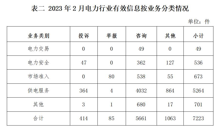 電力行業(yè)排在首位,有效信息數(shù)量為7223件,占全部有效信息的70.37%。群眾關(guān)注的內(nèi)容主要集中在供電服務、電力安全、成本價格和收費等方面。(2023年2月電力行業(yè)有效信息按業(yè)務分類情況見表二)