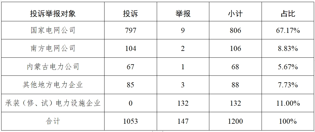 從被投訴舉報(bào)對象看,供電企業(yè)1068件、占投訴舉報(bào)總數(shù)的89.00%,其中國家電網(wǎng)公司806件、占比67.17%,南方電網(wǎng)公司106件、占比8.83%,內(nèi)蒙古電力公司68件、占比5.67%,其他地方電力企業(yè)88件、占比7.33%;承裝(修、試)電力設(shè)施企業(yè)132件、占比11.00%。