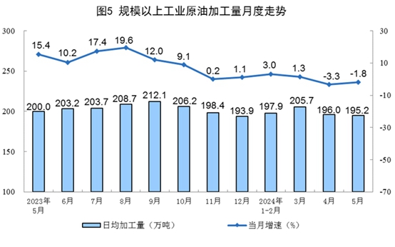 原油加工降幅收窄。5月份,規(guī)上工業(yè)原油加工量6052萬噸,同比下降1.8%,降幅比4月份收窄1.5個(gè)百分點(diǎn);日均加工195.2萬噸。1—5月份,規(guī)上工業(yè)原油加工量30177萬噸,同比增長(zhǎng)0.3%。