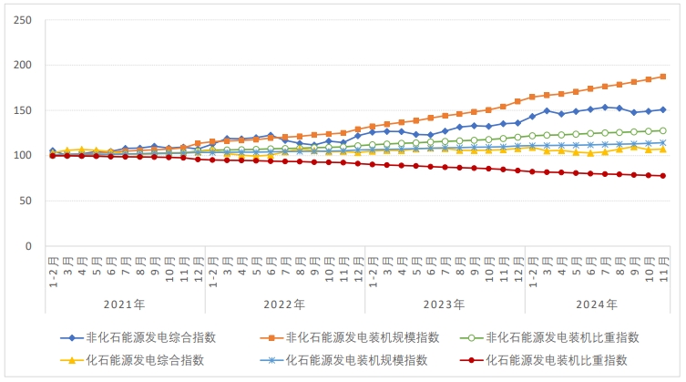 化石能源發(fā)電裝機(jī)規(guī)模指數(shù)為114.3,“十四五”以來(lái)化石能源發(fā)電裝機(jī)規(guī)模累計(jì)增長(zhǎng)了14.3%,同比增長(zhǎng)4.0%?;茉窗l(fā)電裝機(jī)比重指數(shù)為77.7,“十四五”以來(lái)化石能源發(fā)電裝機(jī)比重累計(jì)下降了22.3%(比重從2020年底的55.2%降至2024年11月底的42.9%),隨著新能源裝機(jī)的快速增長(zhǎng),化石能源裝機(jī)比重持續(xù)下降。