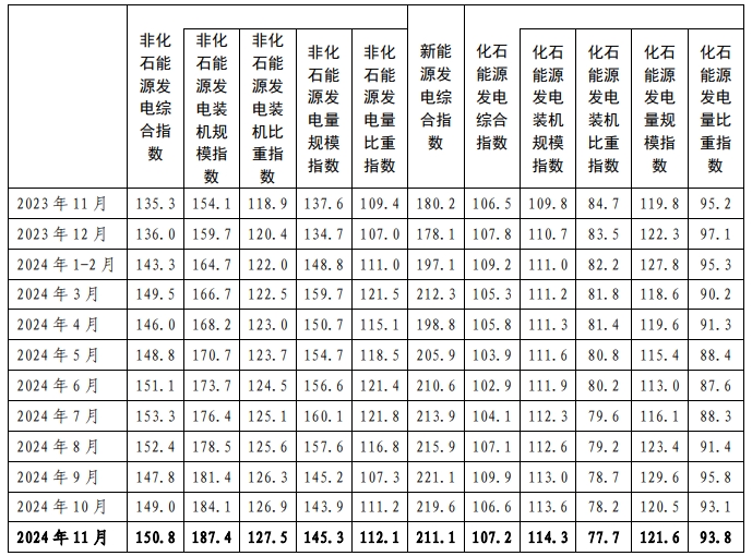 2024年11月,非化石能源發(fā)電綜合指數(shù)為150.8,比2020年基期增長(zhǎng)了50.8%,同比增長(zhǎng)11.5%;其中,新能源發(fā)電綜合指數(shù)為211.1,比2020年基期增長(zhǎng)了111.1%,同比增長(zhǎng)17.1%。在“雙碳”目標(biāo)引領(lǐng)下,非化石能源及其新能源發(fā)電綜合指數(shù)保持快速增長(zhǎng)態(tài)勢(shì)。其中: