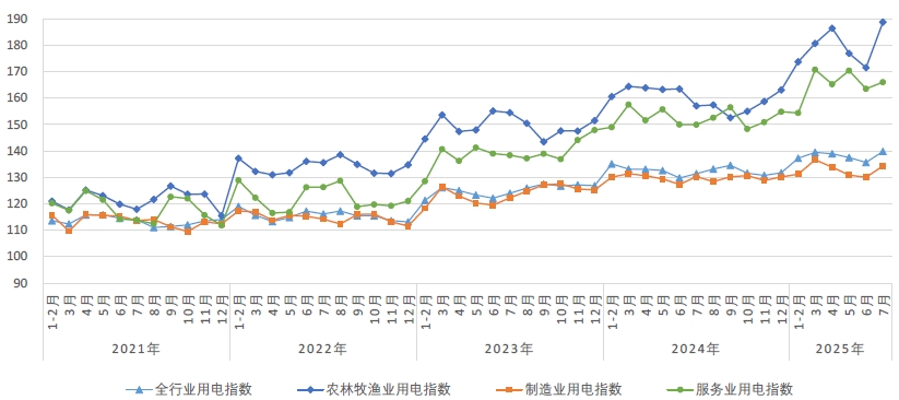 2025年7月,全國(guó)全行業(yè)用電指數(shù)為139.9,全行業(yè)用電量比2020年基期(以2020年基期為100)增長(zhǎng)了39.9%,年均增長(zhǎng)6.9%,同比增長(zhǎng)6.5%,增速比上月提高1.9個(gè)百分點(diǎn)。