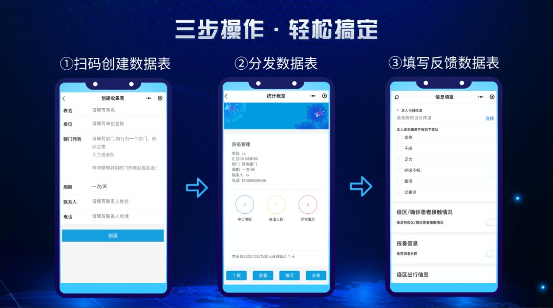 只需微信掃描二維碼進(jìn)入界面,簡單進(jìn)行三步操作即可搞定每日繁瑣的數(shù)據(jù)收集工作,并在系統(tǒng)后臺(tái)進(jìn)行統(tǒng)計(jì)和數(shù)據(jù)匯總。使用說明書?不存在的!一秒上手,簡直So easy!
