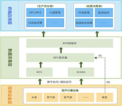 該體系主要由現(xiàn)場設(shè)備層、數(shù)據(jù)采集層、終端應(yīng)用層等組成。他們根據(jù)工藝與計(jì)量要求,先后配備了帶信號遠(yuǎn)傳功能、高準(zhǔn)確度等級的質(zhì)量流量計(jì)、電磁流量計(jì)、超聲波流量計(jì)等智能型計(jì)量儀表,實(shí)現(xiàn)一、二級能源計(jì)量表配備率達(dá)100%。通過計(jì)量儀表傳輸端采集能源計(jì)量數(shù)據(jù),上傳至DCS或SCADA系統(tǒng),再通過OPC接口上傳至實(shí)時數(shù)據(jù)庫,采用5G無線傳輸技術(shù)解決偏遠(yuǎn)區(qū)域計(jì)量儀表信號的數(shù)據(jù)采集與傳輸,最終為終端系統(tǒng)提供有效數(shù)據(jù)支持。