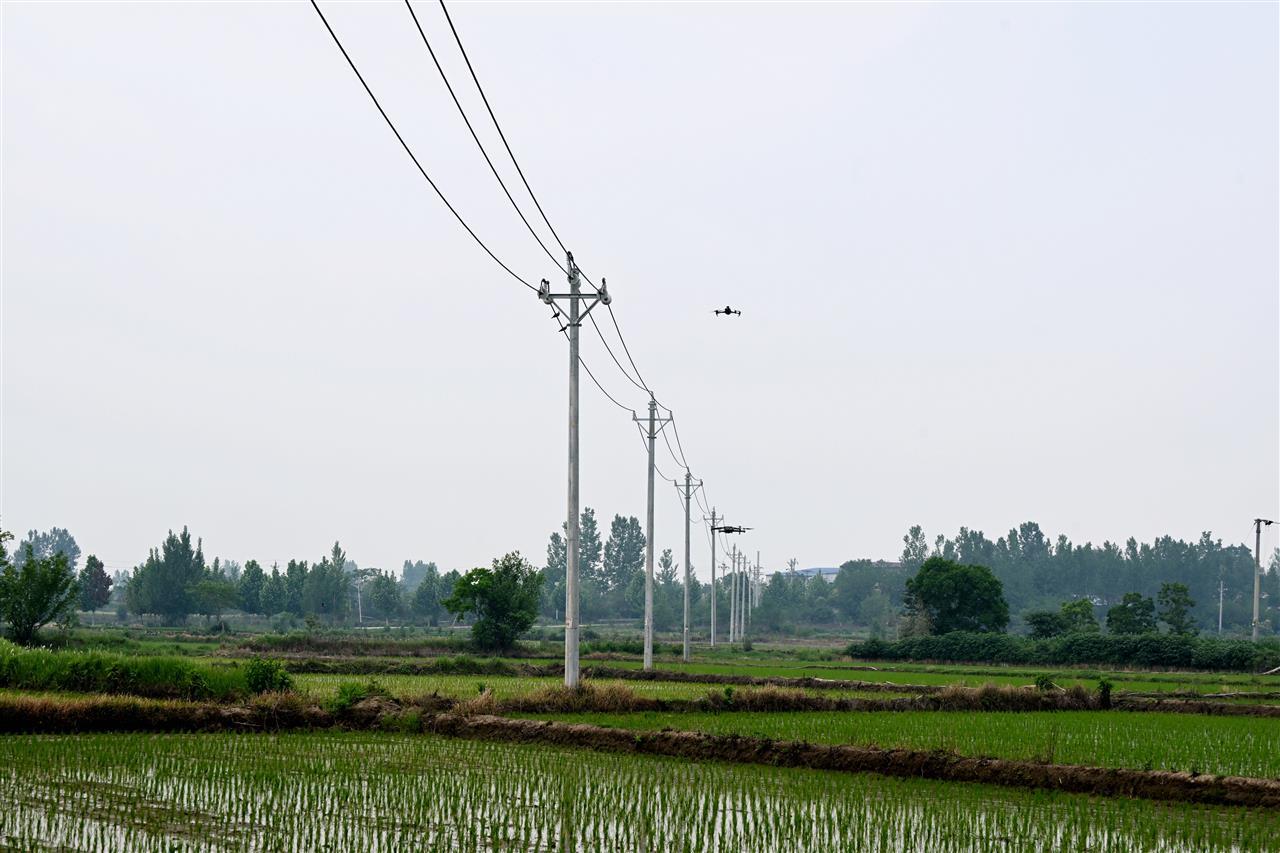 在湖北省安陸市木梓鎮(zhèn)10千伏江河線驗收現(xiàn)場,國網(wǎng)湖北電力利用無人機AI技術(shù)自主驗收配電架空線路(余健兵、何瑤 攝)