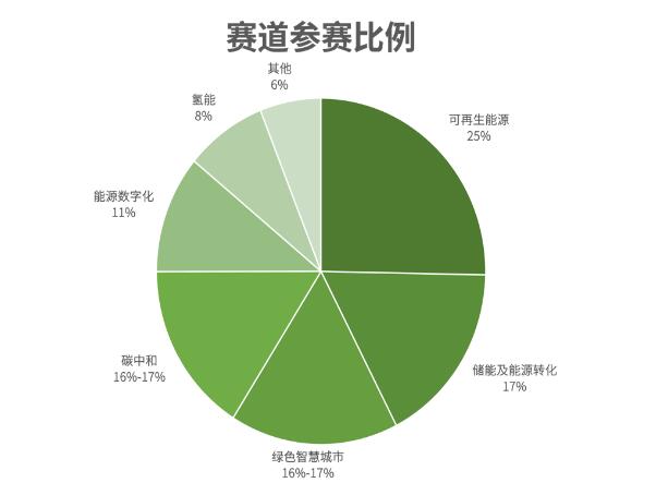 在全球轉(zhuǎn)型非化石能源,以及氣候行動加速的大趨勢下,可再生能源賽道是今年大賽的最熱門賽道,項目占比25%,緊隨其后的是儲能及能源轉(zhuǎn)化賽道,占比17%。城市是人類應(yīng)對氣候變化最重要的陣地,今年大賽新增綠色智慧城市賽道也受到廣泛關(guān)注,與碳中和賽道勢均力敵,兩個賽道占比均在16%-17%之間,能源數(shù)字化賽道占比11%,氫能賽道占比8%。其他創(chuàng)新項目占比6%。
